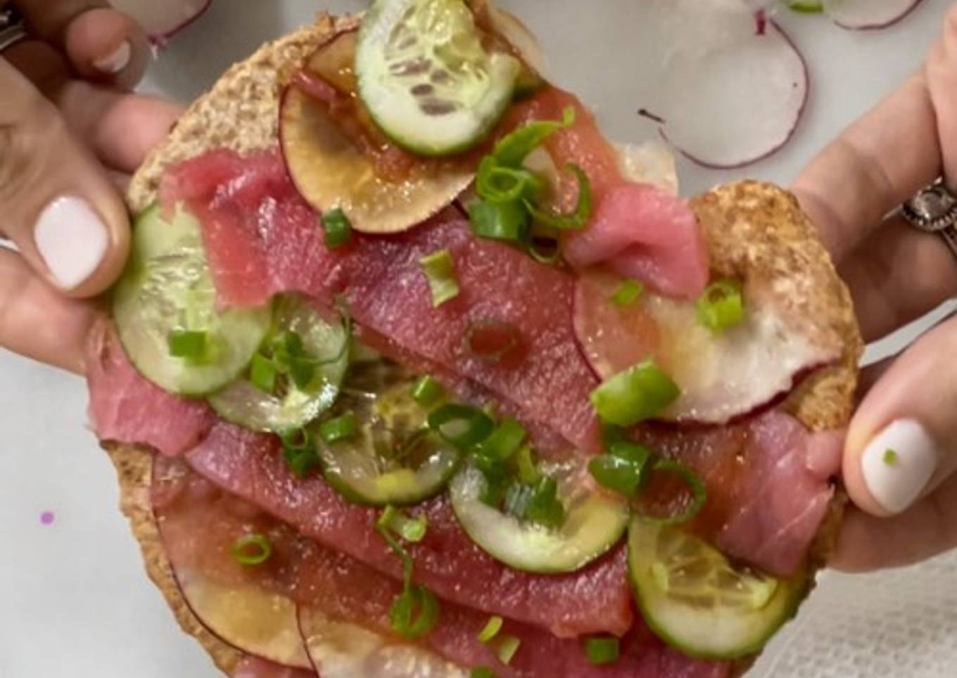 - Alista tu tostada intercalando el atún con el rábano y el pepino. Decora con cebollín, serrano en rebanaditas y con la salsa tamari.